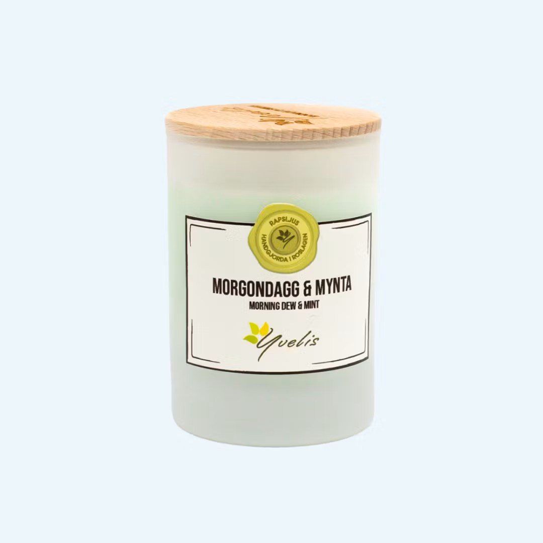 Yvelis doftljus - Morgondagg & Mynta är ett doftljus men en härlig och uppfriskande doft som får dig att tänka på en morgon vid stranden. Citrus och friska marina toner blandas med mint. I botten anas toner av mysk och mild grönska. Alla ljus kommer med trälock av bok. Storleken på doftljusen är lagom till mindre rum som t.ex. sovrum eller badrum.