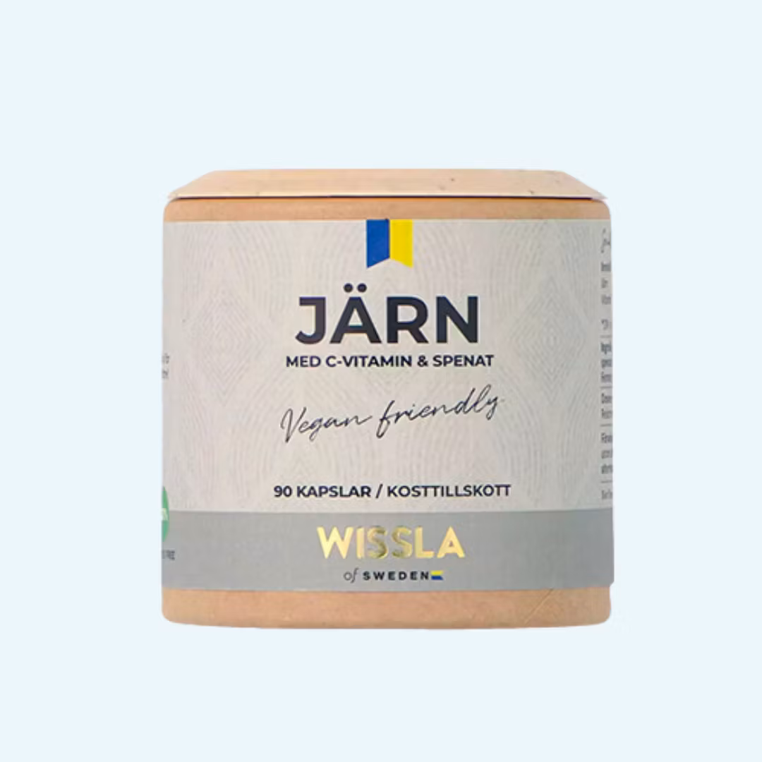 Wissla of Sweden Järn med C-vitamin & spenat är ett kosttillskott som innehåller patenterad järnbisglycinat från Ferrochel™ som är biotillgänglig och snäll mot magen. Denna råvara blockerar inte upptaget av andra näringsämnen, som andra järnprodukter kan göra. Järn är ett spårämne som kroppen inte kan tillverka, och som måste intas via maten vi äter. Järn bidrar till minskad trötthet och utmattning. Järn bidrar även till normal bildning av röda blodkroppar och hemoglobin; normal syretransport i kroppen och normal energiomsättning.